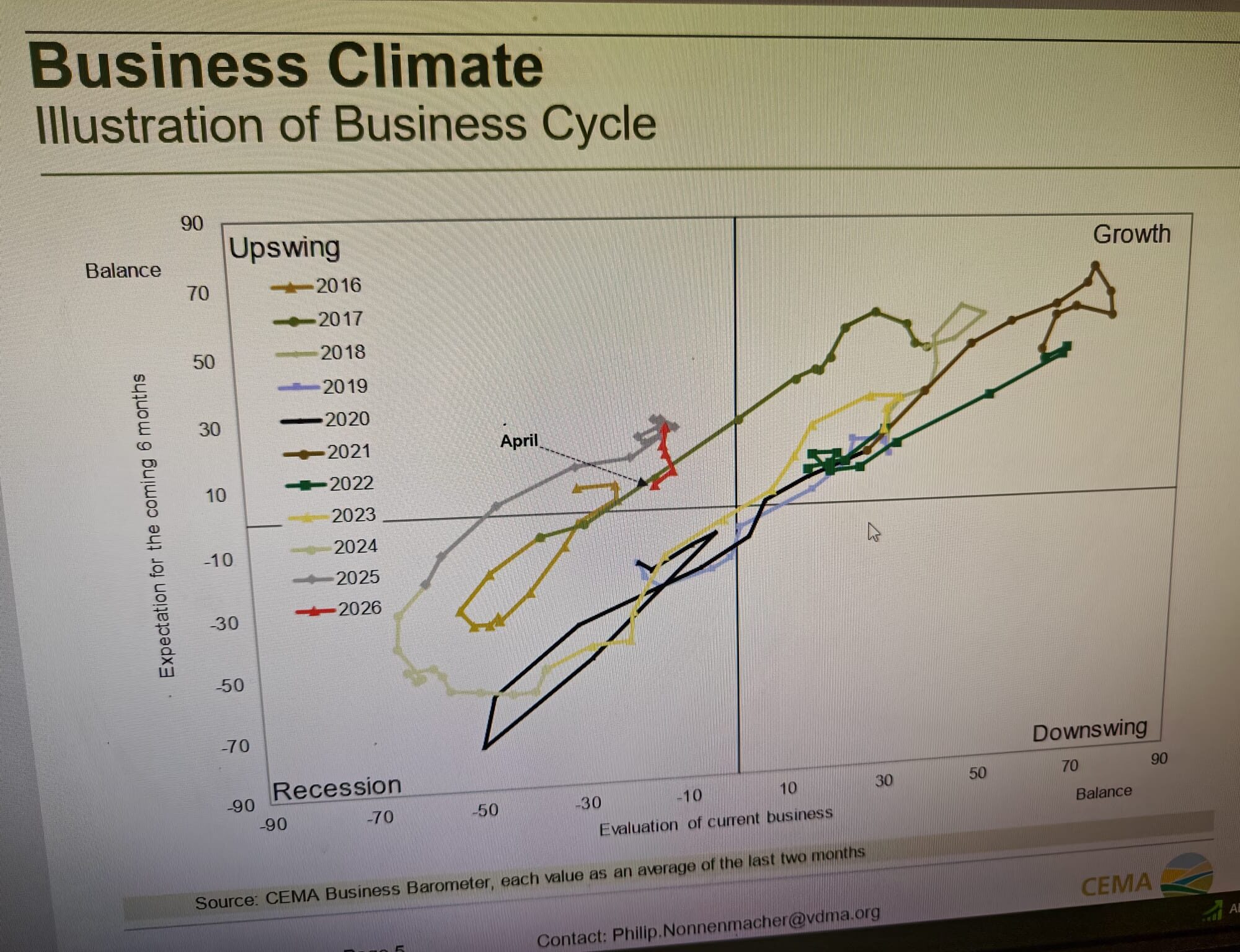 De 140 ondervraagde managers in de sector hebben hun verwachtingen voor wat betreft orders en omzet voor de komende zes maanden, verder naar beneden bijgesteld. De Cema Business Climate Index komt in april uit op -6 punten. Een maand eerder was dat nog -2 punten. Ongeveer een derde van de ondervraagde managers rekent op minder orders in het komende halfjaar, terwijl slechts een vijfde toch nog groei verwacht. Die terugval is vooral te zien bij de machines voor de akkerbouw. Bij de fabrikanten van deze machines scoort het ondernemersvertrouwen het laagst. In veehouderij verbetert het beeld juist en ligt het vertrouwen boven het gemiddelde. Bedrijven passen hun plannen dan ook voorzichtig aan. De meeste fabrikanten houden hun personeelsbestand dan ook nog wel stabiel. Een kwart van de bedrijven ontslaat een aantal tijdelijke werknemers.