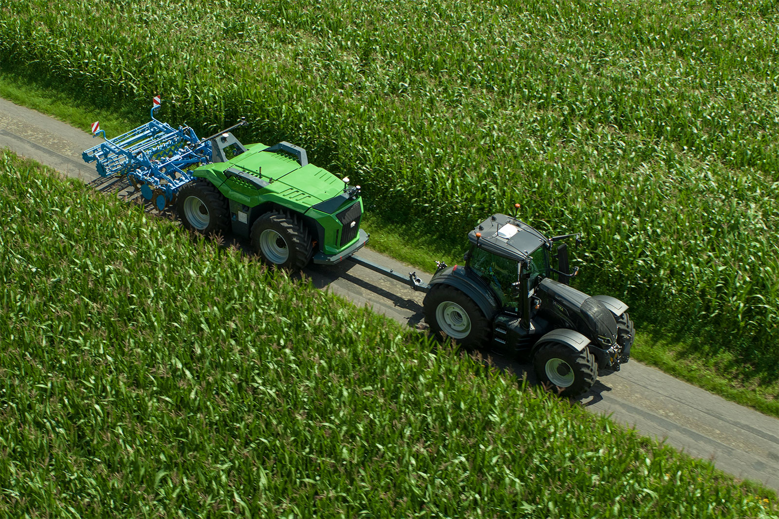 Autonome trekker van Krone en Lemken met trekboom over de weg vervoeren