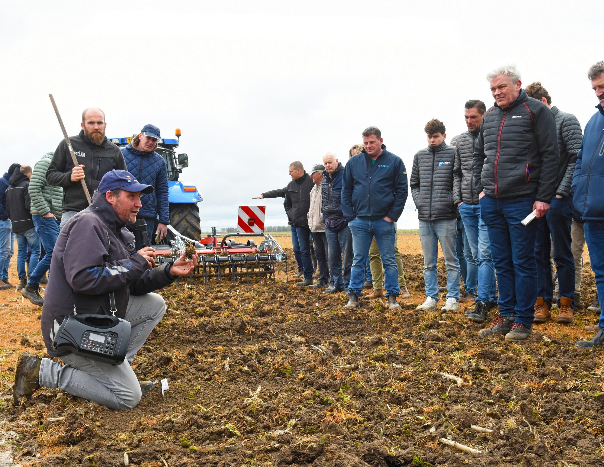 Tijdens een demonstratie in Zuid-Beijerland (ZH.) toont Christoffel den Herder van adviesbureau Ceres Horti Advice zijn gehoor een kluit waarin nog een groenbemester wortelt. Als dit gewas niet doodgespoten zou zijn voordat er een vernietigende bewerking werd uitgevoerd, dan zou het plantje verder groeien na een regenbui.