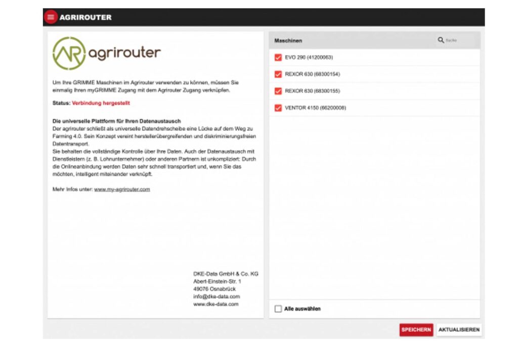Bovendien is myGRIMME “agrirouter ready”, zodat een directe verbinding en vrijgave van de agrirouter door de operator DKE uit Osnabrück geregeld is.