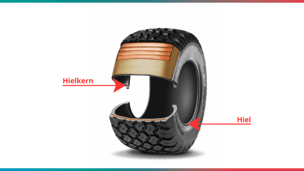 De hiel is onzichtbaar ingebouwd in het onderste deel van de band, daar waar deze op de velg gemonteerd wordt. De hielkern bestaat uit meerdere berubberde staaldraden van ongeveer anderhalve centimeter dik. Door meer draden naast elkaar te gebruiken en door ze meerdere keren tot een spoel te wikkelen, bouw je een zwaardere hiel die grotere krachten kan opvangen. Die krachten zijn fors en werken in alle richtingen. Je moet denken aan stuurkrachten, rem- en acceleratiekrachten en tractie/torsiekrachten, maar ook aan zijwaartse afschuifkrachten. Bovendien moet de hiel luchtdicht op de velg gemonteerd worden. Het rubber onder de hiel wordt daarvoor zo´n 45% samengedrukt om de band vast en luchtdicht te monteren. Deze hoge hielcompressie is nodig om bij lage bandspanning en hoge wringkrachten in bochten, bewegingsloos op de velg te blijven zitten. Soms lijkt dat, bijvoorbeeld bij hoge trekkracht, nog niet voldoende doordat de band gaat draaien op de velg. Dan ondersteunen de ribbels (knurling) op de velgzitting nog iets, of je kunt de hielen dan met een speciaal afdichtingsmiddel “verlijmen” op de velg. Hoewel het bij tubeless banden op het oog niet heel ernstig lijkt, moet het draaien op de velg worden voorkomen omdat de hiel intern kan torderen en onherstelbaar beschadigd worden. Als er een binnenband is gebruikt, is bovendien de kans op afdraaien van het ventiel groot, met alle gevolgen vandien.