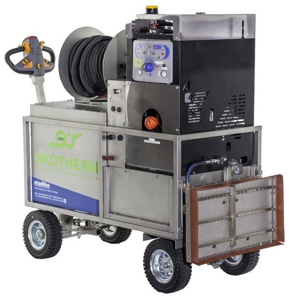 Stadiko en Keckex hebben samen de nieuwe Ökotherm-heetwaterinstallatie ontwikkeld. Deze installatie staat op een chassis met elektrische wielaandrijving en kun je daardoor eenvoudig verplaatsen.