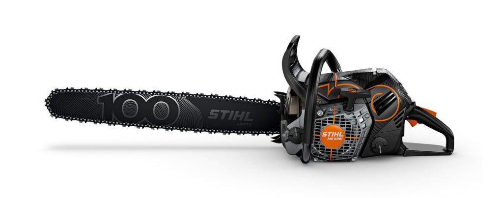 Ter gelegenheid van het 100-jarig bestaan komt Stihl met een speciale jubileumeditie van de MS 500i-kettingzaag. De machine is voorzien van carbonzwarte beschermkappen, een bedrukt zaagblad en een speciaal jubileumlogo aan de bovenkant.
