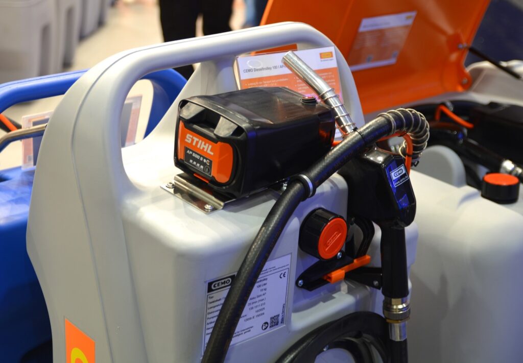 Cemo komt met meerdere mobiele dieseltanks die werken met behulp van een Stihl AP-accu. De accu levert stroom voor de aandrijving van de pomp.