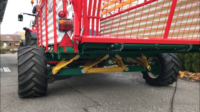 De Swiss Master heeft een totale breedte van 233 centimeter in transportstand. In de werkstand wordt de opraapwagen door de uitschuifbare assen 80 centimeter breder. De Swiss Master + is in transportstand 255 centimeter breed. In de werkstand komt er ook bij deze wagen 80 centimeter bij. Beide opraapwagens zakken in werkstand 18 centimeter. Dat moet zorgen voor nog meer stabiliteit. (Agrartechnik.ch)