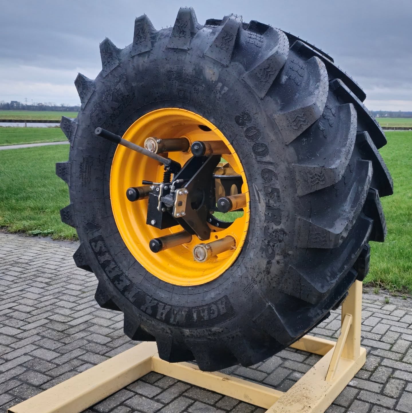 Van Laar Techniek uit Hoogland (U.) komt met verstelvelgen voor op de shovel. De spoorbreedte van de voorbanden zijn hydraulisch naar buiten te stellen voor meer stabiliteit bij het aanrijden van de kuil.